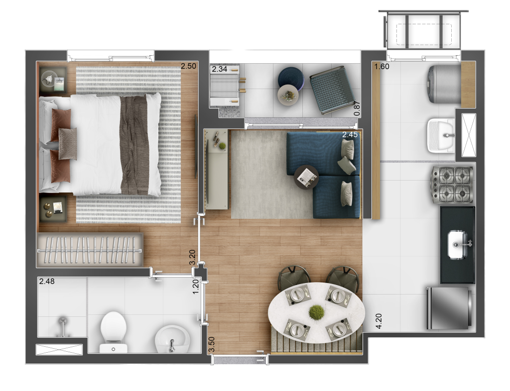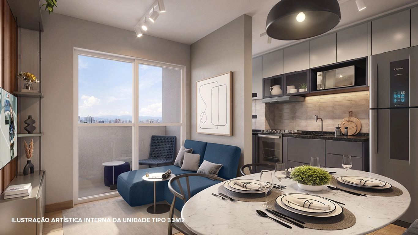 Ilustração artística da unidade-tipo de 1 dormitório/suíte de 33,03m²
