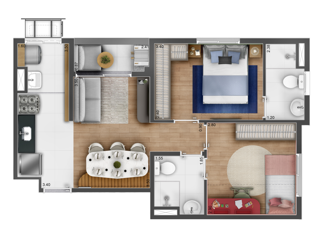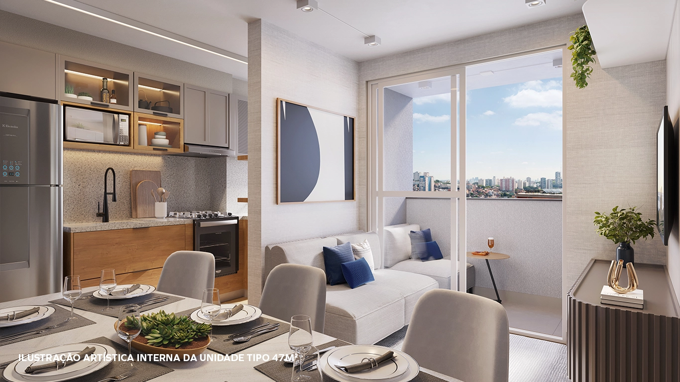 Ilustração artística da unidade-tipo de 2 dormitórios/suítes de 47,12m²